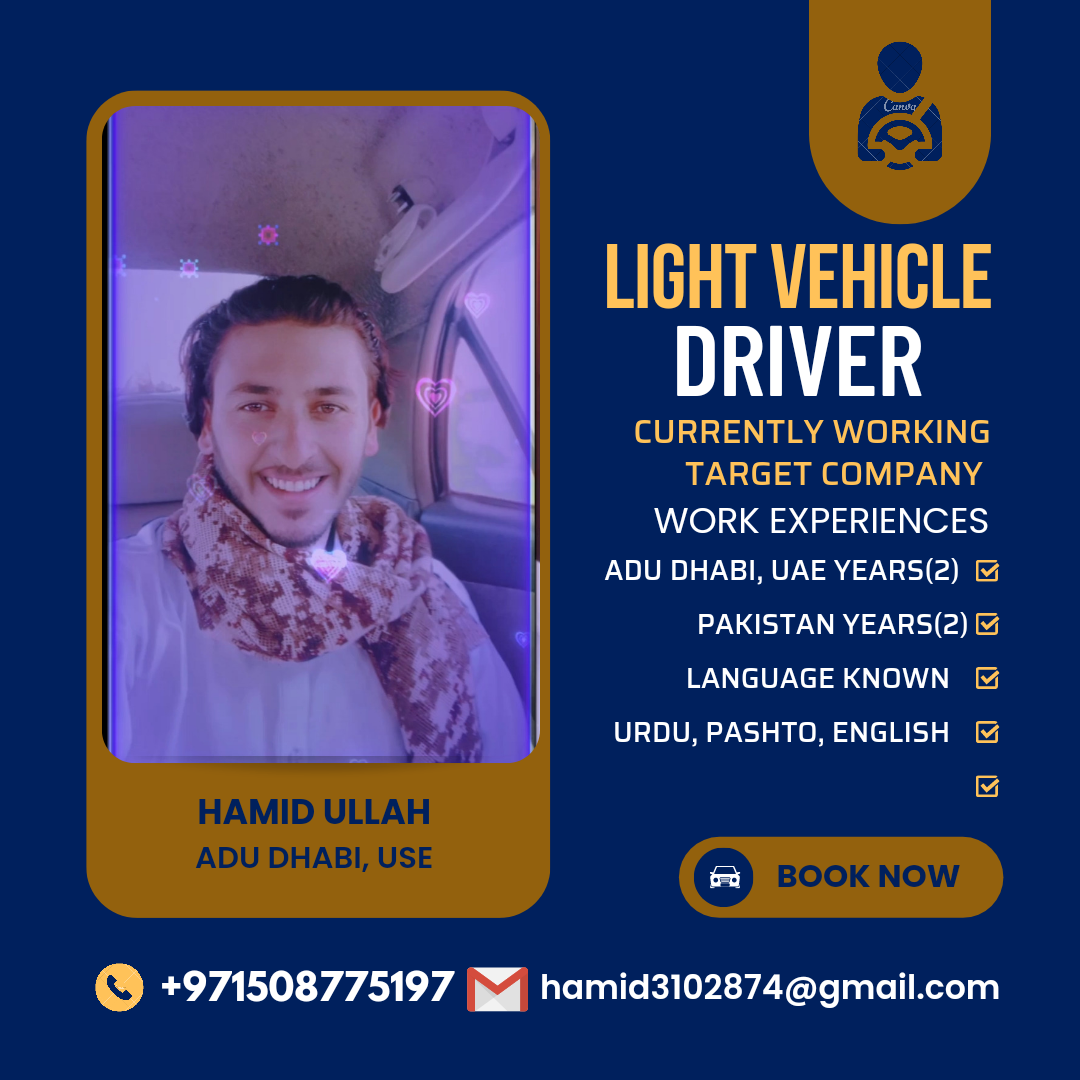 My name is Hamid ullah and Pakistane I'm looking for job light vehicle driver