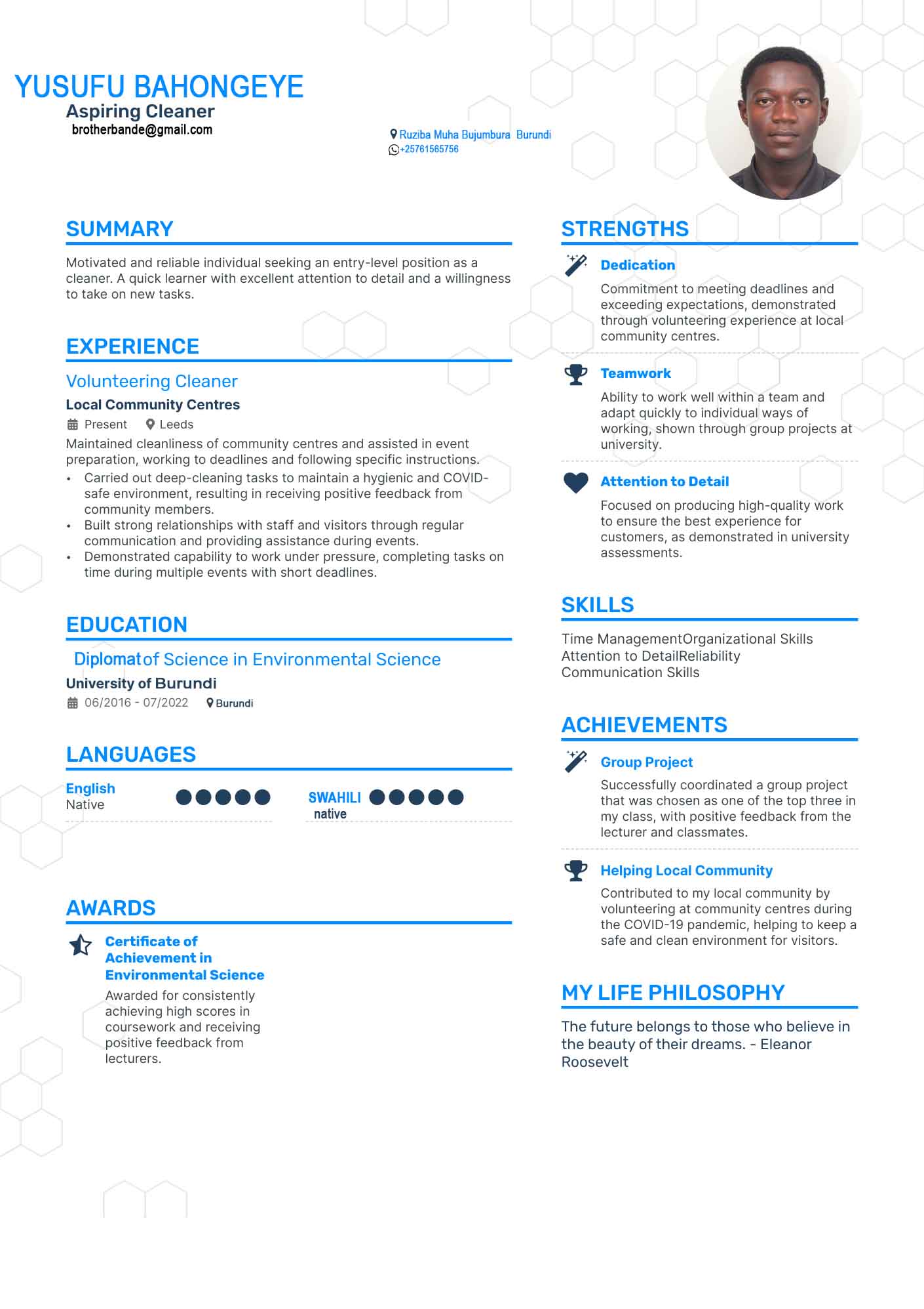 Dear leader, partners, my name is Bahongeye Isufu. I am a skilled worker in various sectors, namely the sanitation and housing sector. I want to be your employee in your organization to show my ability to work with you to develop efficiency in work and competence in work.